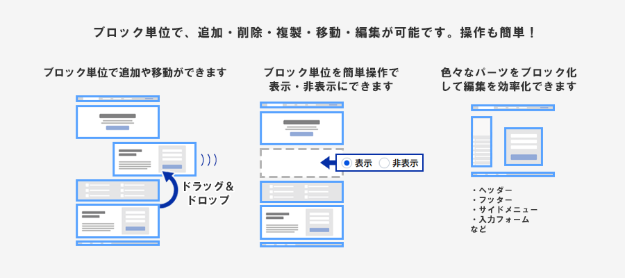 ブロック編集機能 を使えば、任意のレイアウトや機能を一つのブロックにまとめ、ブロック単位で挿入、削除、移動、コピー、編集ができます。 コンテンツはもちろん、ヘッダーやフッター、サイドメニューやフォームなどブロック化するパーツを自由に作成できます。ブロック単位で表示や非表示の切替もできるため、イベント運用やデバイス表示管理にも活用が可能です。