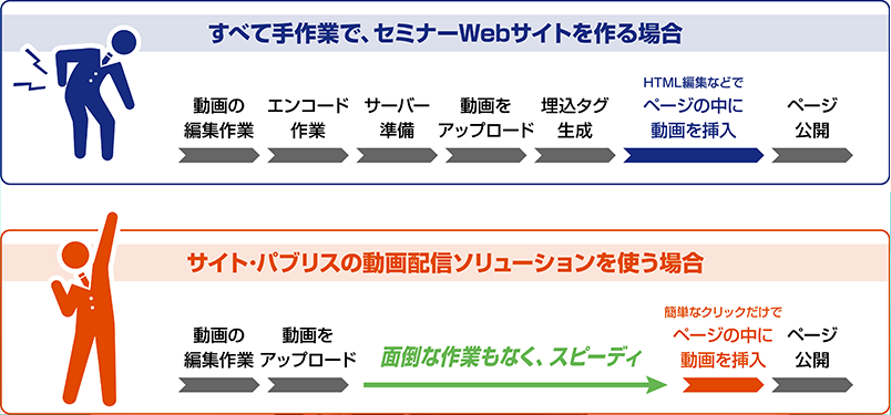 金子様:サイト・パブリスさんのシステムの場合、操作方法もシンプルで分かりやすかったです。編集が終わった動画をアップロードして、いくつかボタンをクリックするだけだったので、迷うこともありませんでした。また、動画をあらかじめエンコード(サイズ圧縮や形式変換)する必要もないので、作業がスムーズになりました。