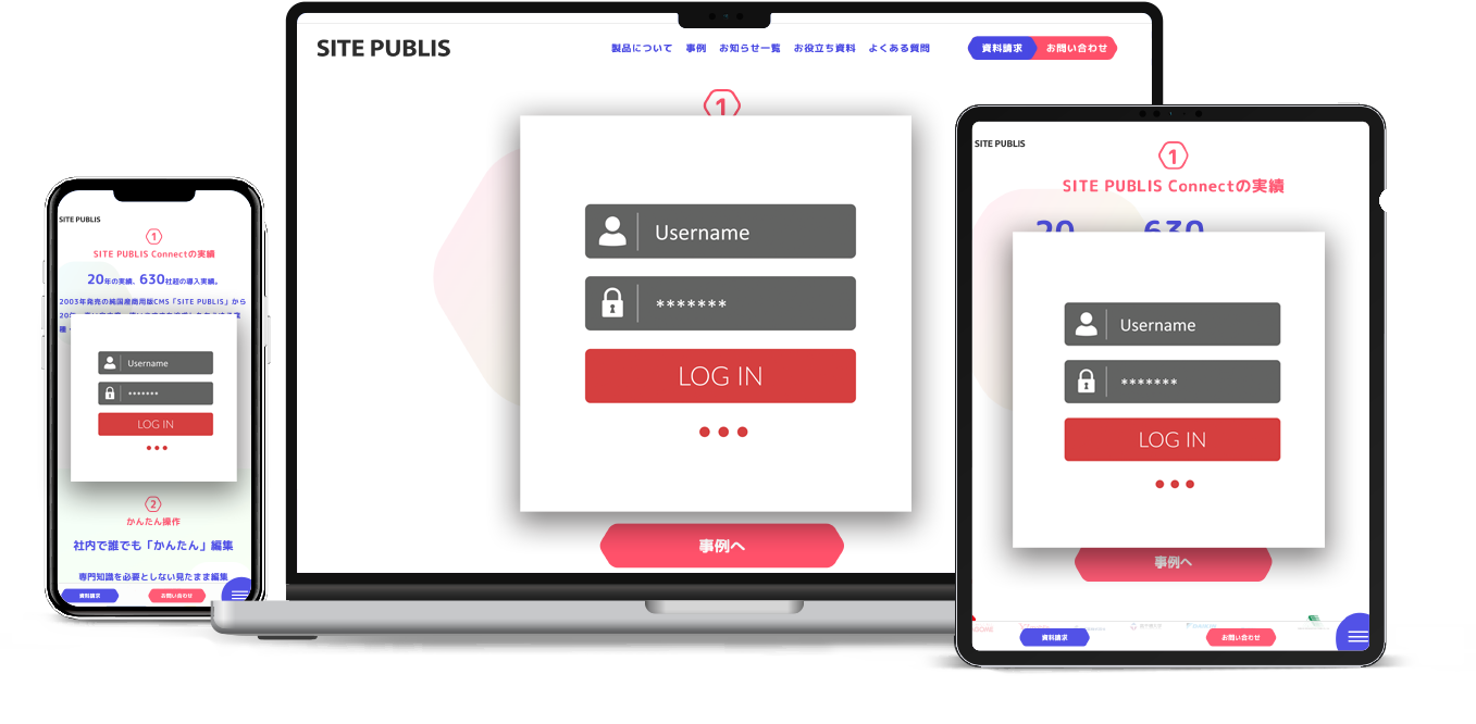 国産CMS「SITE PUBLIS」は、会員のログインや受付フォーム、登録・編集・削除などの会員サイトの基本機能を備えています。CMSとして簡単にページが作成・編集でき、権限や承認フローにも優れているため、会員機能を導入するだけではなく組織が会員サイトを運営する上で利便性の高いホームページを構築することが可能です。