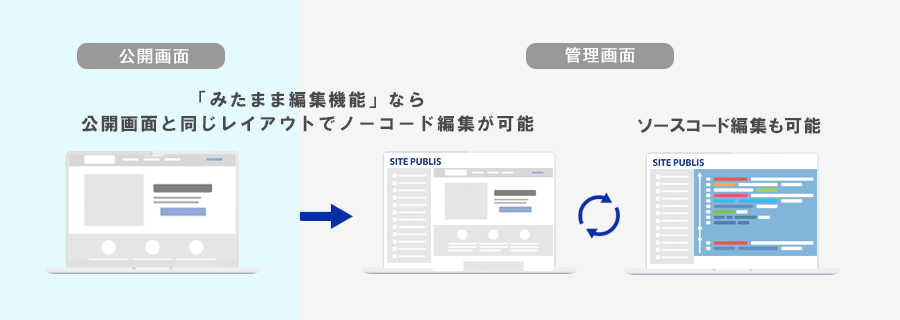 組織内で専門知識がないチームを含めた更新体制を目指すことも可能です。ソースコードでの編集と切替もできるので、デザイン部門やウェブ制作会社などとの共存も可能です