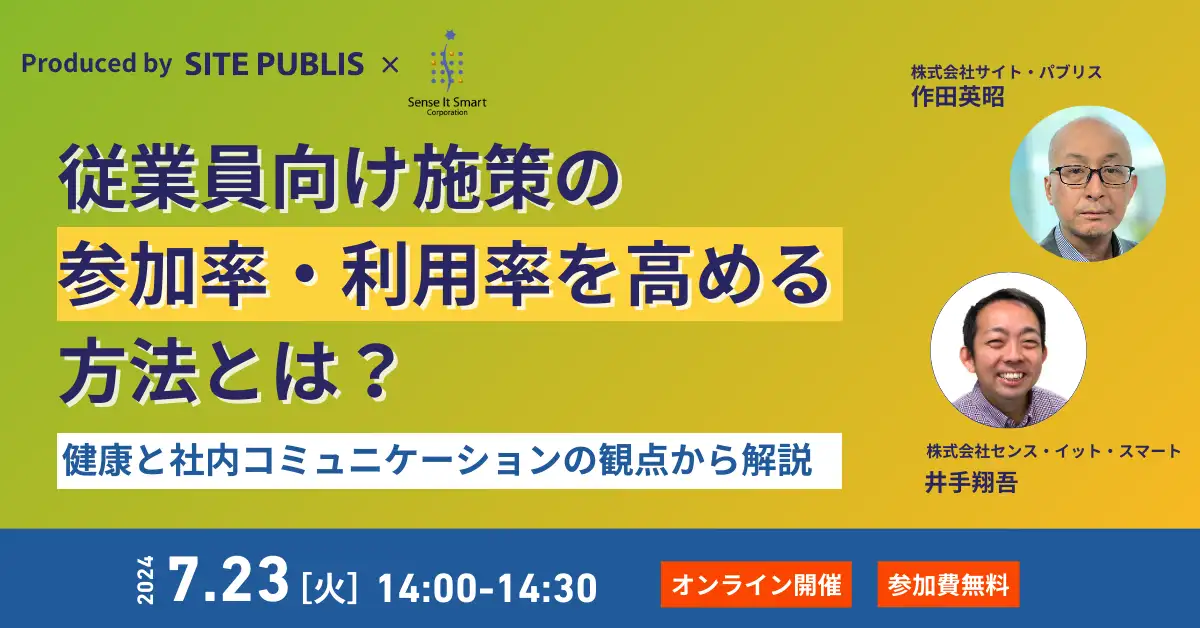 本セミナーでは、健康増進と社内コミュニケーションの観点から、施策の利用率・参加率を向上させ、人材定着に結び付ける方法について解説します。